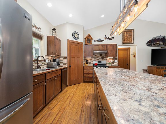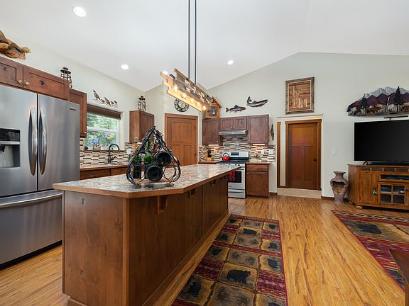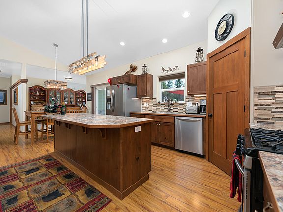 Wildlife abounds at this perfectly appointed Timbered Ridge Home. Better than new, all landscaping, sprinklers and gravel are in. An amazing 10 acres of land with endless possibilities to build a shop, barn or simply enjoy the Timber. Vaulted ceilings and open floor plan separate the Main floor master from guest rooms. This home boasts 3 bed 2.5 baths plus an office and over 1800 sqft. of room. High end finishes throughout, from solid wood doors to the custom tile work in the kitchen and Master bath, to the beautiful front door and custom lighting and blinds. Exterior is top notch as well, don't miss this home! Come live where the deer and moose literally play!