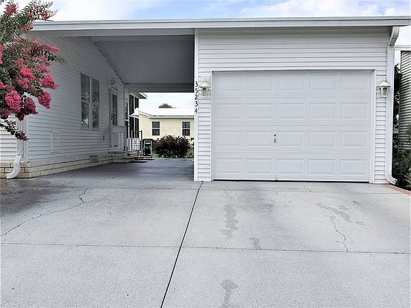 This is a large (1620 sqft) Palm Harbor home with three bedrooms, two full bathrooms, a sitting room and a huge Florida room. The HVAC unit was replaced in 2017. The roof is original. There is a single car garage PLUS a large golf cart garage PLUS a single car carport PLUS a covered patio breezeway. This home comes unfurnished. Home has lots of storage space. This home is on LEASED LAND with a monthly lot rent of $715.00 in the PREMIER Southport Springs Golf and Country Club community (55+ and pet-friendly). KITCHEN & EAT-IN AREA Galley-style with plenty of cabinets, counter space and a large pantry. Appliances includes a GE smooth-top stove, GE side-by-side refrigerator with water and ice dispenser, a built-in GE microwave and a Bosch dishwasher. The Corian counters have a tile backsplash. The floor is beautiful pecan wood and there is a skylight. DINING AREA (10' x 14'3") Huge area for table, chairs and a hutch. There is a hanging light over the table area and the floor is carpeted. LIVING ROOM (14' x 17'6") Large room with a lighted ceiling fan, carpeting and a beautiful tray ceiling. The front entrance area has pecan wood flooring. MAIN BEDROOM (12'6" x 13'6") Good-sized room with carpet, lighted ceiling fan and a big walk-in closet. SITTING ROOM/DEN/OFFICE (9'5" x 11'3") Leading to the master bedroom is a flexible room to fit your needs. It has a lighted ceiling fan and carpet on the floor. MAIN BATH Large bathroom with a wide, double-sink vanity, tiled, walk-in shower, a garden tub for soaking and a three linen cabinets. The floor is ceramic tile, the counter is Corian and there is a skylight. BEDROOM #2 (11' x 12'6") Has a big walk-in closet, carpet on the floor and a lighted ceiling fan. BEDROOM #3 (9'9' x 12'6") The floor is carpeted, there is a lighted ceiling fan and a walk-in closet. GUEST BATH Has a single-sink vanity, medicine cabinet and a walk-in shower. The floor is ceramic tile. There is a wall-mounted cabinet over the toilet. LAUNDRY Located near the carport entrance to the home you will find the Roper washer and dryer. There are four cabinets above, the floor is ceramic tile and there is a utility closet. FLORIDA ROOM (10'6" x 22') Huge room with ceramic tile flooring, two lighted ceiling fans, double pane glass windows and an LG, wall AC unit. The roll sun shades are made of wood. EXTERIOR Has a 12' x 21'6" car garage, a 10' x 12' golf cart garage, a 12' x 21'6" carport and a 10' x 12' covered patio/breezeway. The garages have a loft, additional shelving, a workbench and a sink. The home sits on a corner lot. The yard is nicely landscaped with concrete cubing around the beds and there are three citrus trees on the property (orange, lime and grapefruit). The asphalt shingle roof is original and the Tempstar HVAC was new in 2017. Southport Springs Golf and Country Club is the premier 55+ manufactured home community in Zephyrhills. It is beautifully landscaped and maintained. The clubhouse is large and modern. There is a restaurant and bar. The residents are very active and pets are welcome. The lot rent for this home is $715.00 per month . There is an additional pass-on tax of $55.84 per month and a monthly trash pick-up fee of $12.18. All listing information is deemed reliable but not guaranteed and should be independently verified through personal inspection by appropriate professionals. American Mobile Home Sales of Tampa Bay, Inc. cannot guarantee or warrant the accuracy of this information, measurements or condition of this property. Measurements are approximate. The buyer assumes full responsibility for obtaining all current rates of lot rent, fees, and pass-on costs. Additionally, the buyer is responsible for obtaining all rules, regulations, pet policies, etc., associated with the community, park, or home from the community/park manager. American Mobile Home Sales of Tampa Bay, Inc. is not responsible for quoting of said fees or policies.