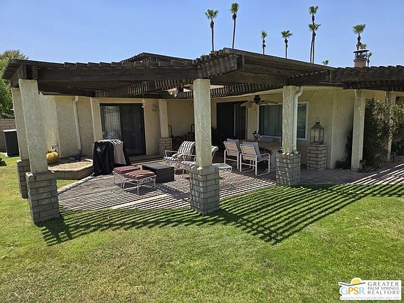 ENJOY the best that this updated 3 bedroom,2 bath 1600 sq ft golf course view rental home has to offer in one of the premier 55+ golf course communities in the desert valley: Ivey Ranch. This beautiful community with 9 holes of golf meandering through it offers restaurant (That's a Wrap), tennis/pickleball courts, clubhouse with main pool/spa and other satellite pools (one within walking distance of this home). Home is being offered turnkey furnished with upgrades that include but not limited to of new flooring in all 3 bedrooms, new 5 Ton HVAC system, new Washer/Dryer units and more. This home sits in a cul-de-sac location and overlooks the golf course from a dedicated viewing bench, not to mention a large backside patio that also has views of the green belt adjacent to the golf course. The Primary Bedroom and Living Room both have slider access to back patio....Living Room also has a fireplace. The rental includes perks of basic cable + internet and trash. Tenant will be responsible for elec, gas and water. Make this rental home your desert sanctuary. Who knows, you may want to purchase it down the road. Owner will consider a lease/option to purchase contract.