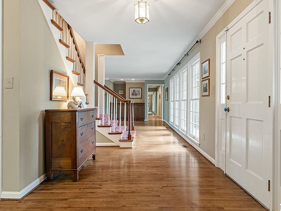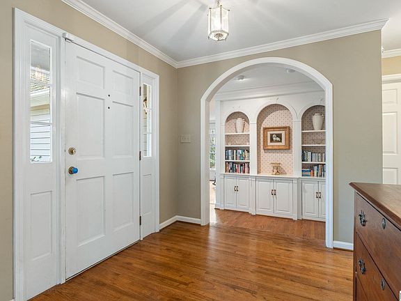 Positioned on a large wooded private lot is this incredible opportunity that offers level access inside boasting four bedrooms and three and a half baths.Step inside to beautiful hardwood floors fresh paint high ceilings recessed lighting and beautiful windows.A formal living space offers wonderful built-ins and is the perfect place to retreat.The large den features wonderful lighting a beautiful brick fireplace hardwood flooring and wet bar area.Step out directly from the den to the spacious deck that overlooks incredible gardens and fenced yard.The large kitchen includes beautiful brick flooring walk-in pantry wood top island endless cabinetry stainless appliances and breakfast room and laundry.A main level office with seagrass flooring is so convenient offering a built-in desk and storage and walk-in closet space.The main level primary bedroom is complete with primary bath.Upstairs are three large bedrooms two full baths and an additional climate controlled storage space.Must see!!