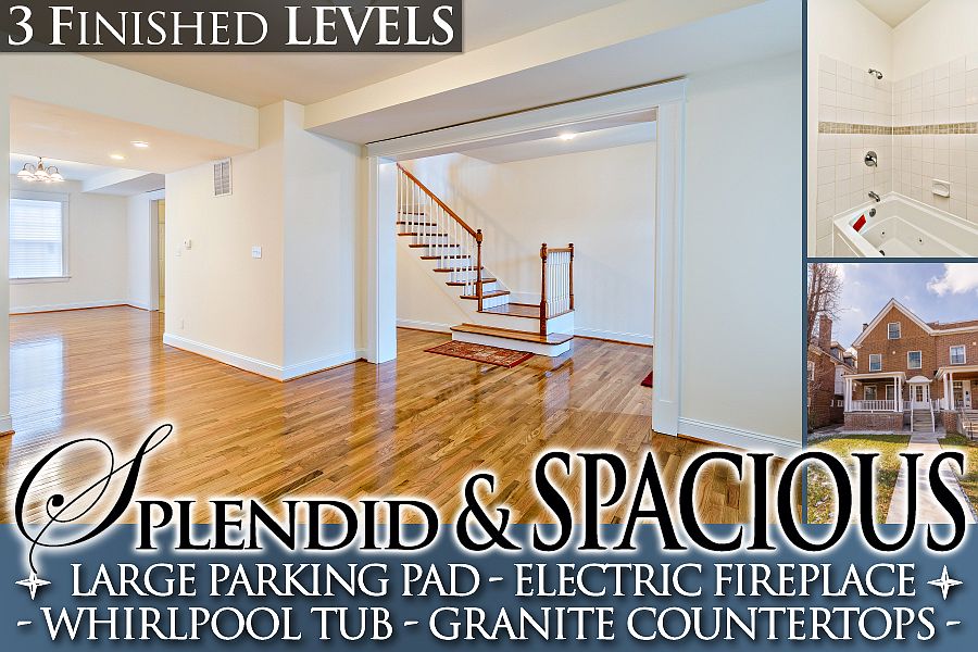 WOW LOOK AT THIS OPPOTUNITY Super bright and spacious end unit townhome with over 2600 sq ft of living space. Perfect for large family or a roommate situation. Beautiful hardwood floors, living room with FP, separate DR, 1/2 bath and Kitchen w/granite counters; 2nd level master suite, 2 add bdrms with hall bath; 3rd floor w/2 bdrms and another full bathroom. 4 space off-street parking in rear.