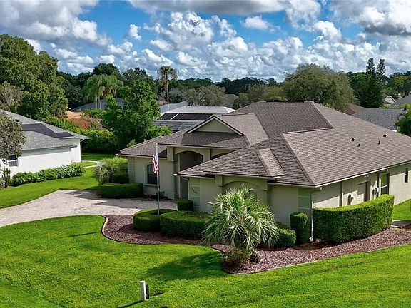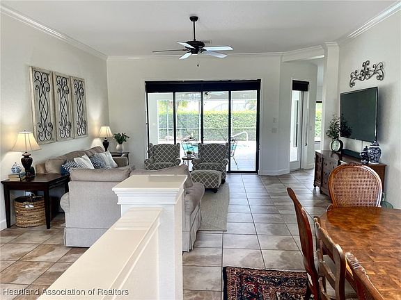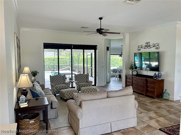 This Florida Pool Home is move-in ready in the gorgeous Manor Hill subdivision of Sun N Lakes in Sebring, Florida. You will notice the brick paver driveway, decorative lead glass front door, arched windows, lush landscape that offers great curb appeal. Built in 2006 with a great living room and dinning area, three bedrooms, large heated 14x28 crystal blue pool, with a screened in pool patio which includes an air conditioned half bath in the screened pool area and an exterior shower. The kitchen has cherry solid wood cabinetry, pull out kitchen shelves, under cabinet lighting, Corian countertops, stainless steel appliances and an eat-in breakfast nook. High 10ft ceilings and crown molding, new top-quality carpet installed in all bedrooms in 2024, freshly painted walls in 2023 and ceramic tile throughout the kitchen and main living area. The thermostat and front door locks are smart controlled. The Pool area can be seen from the living room and kitchen and can be easily accessed through the fully recessing sliding glass doors. The main bedroom has tray ceiling and glass door access to the pool area. The main bathroom has a soaker tub, marble shower and large closet. The laundry /utility room has extra storage space and a utility sink. There is a large two car climate controlled garage and with a side access door for your golf cart. Sun N Lake features two championship golf courses, tennis courts, pickleball courts, the Island View Restaurant and community pool. Plenty of events to enjoy year round.