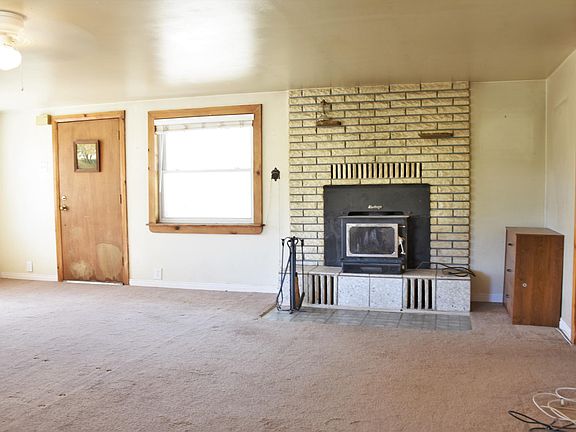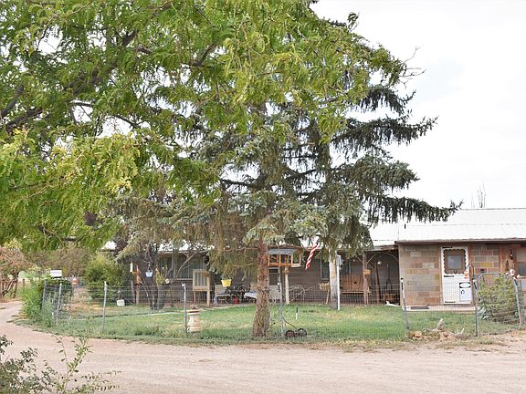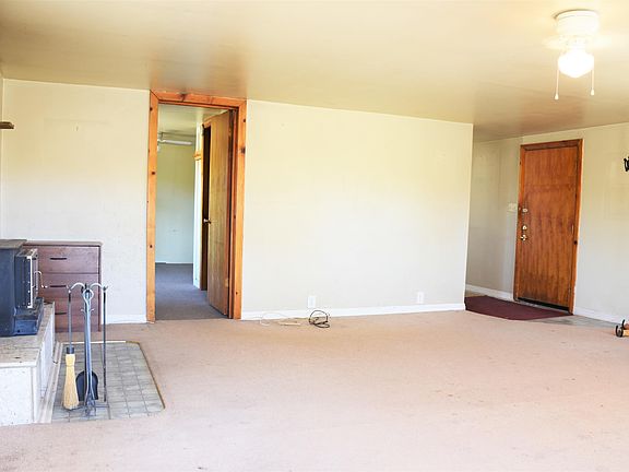 Cozy home on beautiful 5 acres! Large mature trees throughout the property, sprinkler system, outbuildings, grass and fencing. Located about 10 minute drive from town. Spacious garage, perfect for storage and projects. Living room has a fireplace, lots of windows and access to outside. Property well and 3 acre feet of water included. Unique little home with lots of potential.