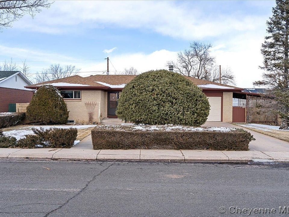 Beautiful mid-modern ranch style home situated on a corner lot with impeccably kept landscaping. Covered side patio, fenced backyard with detached 2 car garage with pit, 2 wood burning fireplaces, original hardwood floors under carpet. This home has been lovingly taken care of and ready for you to update as you would like. Home being sold as-is!