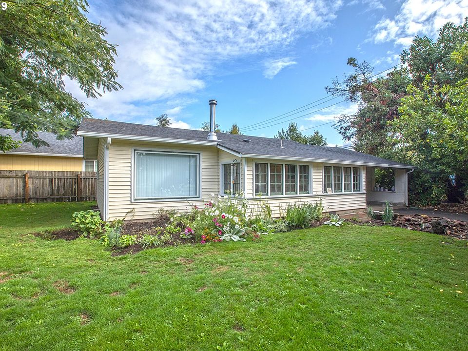 Cute and cozy two bedroom home with large front/side yard. New carpet throughout. Enjoy bright and cozy sunroom; large family room with wood stove; Kitchen with built-in bench seating, dishwasher and refrigerator. Fully fenced yard, low maintenance vinyl siding, brand new roof. Laundry room off of garage with storage.