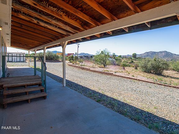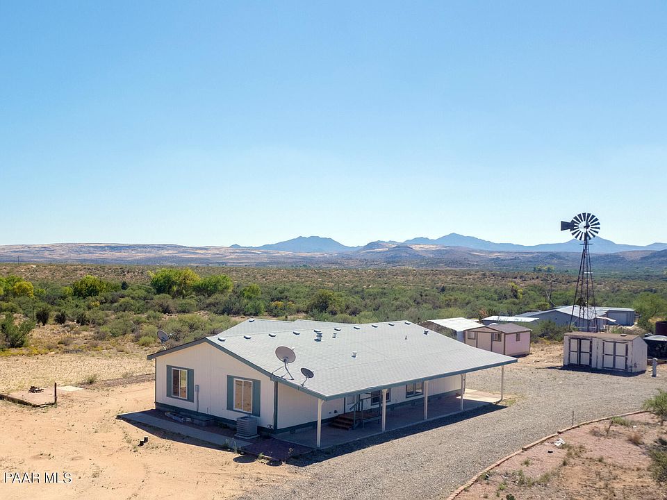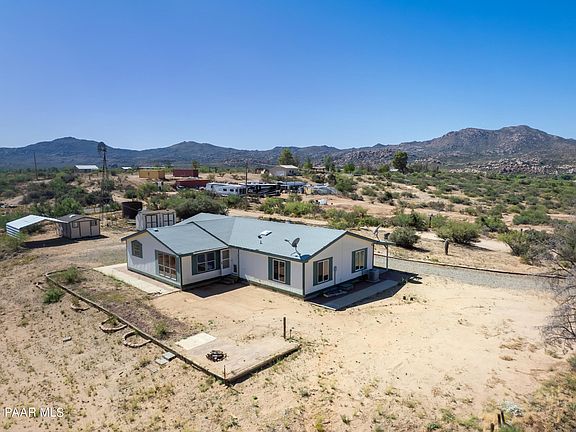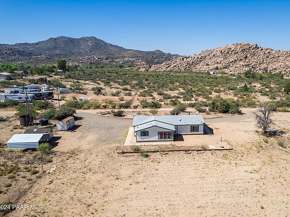 Breathtaking views in all directions and 7 acres backing up to ranch land gives you peace of mind that your privacy and views will be preserved for years to come. Equal distances from Prescott and Wickenburg, and only 37 minutes from Bagdad, this property is perfectly situated for someone wanting to live off the beaten path but close enough to amenities for convenience. A seasonal wash cuts through a portion of the back of the property, creating a beautiful topographical feature and a unique experience during our rainy season. This mostly level lot is excellent for horses, farm animals, gardens, and homestead living. The 3 bedroom, 2 bath home has stunning views from all the windows, large rooms for comfort, and plenty of storage built in! With a brick stem wall, poured cement walkways around the home, and spacious, covered front patio, maintenance is easy and the home has excellent foundations.