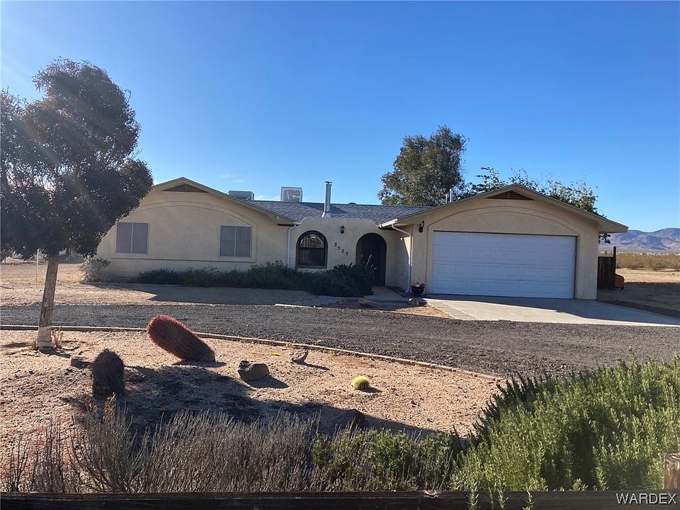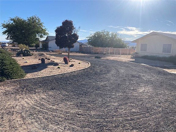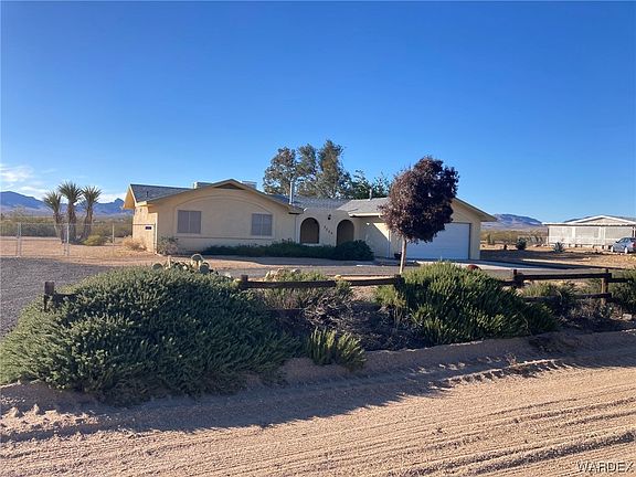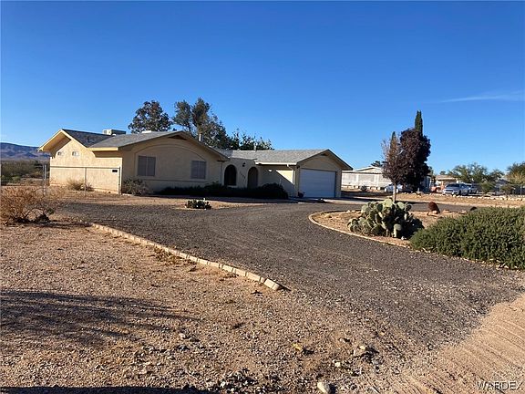 This site built, all electric, home sits on just over 1/2 an acre in a desirable paved street subdivision not far off Hwy 68 in central Golden Valley. Home features 3 bedrooms, 2 full bathrooms, large living room with wood burning stove, oversized attached 2 car garage with walls of storage cabinets, fully chain link fenced back yard and a large circular driveway. Cozy and private front covered patio is perfect for your morning coffee. RV gate to rear and plenty of room to park all your toys and a large storage shed. Fairly new heat pump/AC unit as well as a swamp cooler. Refrigerator and full size upright freezer stay with home. Just 15 minutes to Kingman or 20 minutes to Bullhead City and Laughlin for shopping and entertainment.