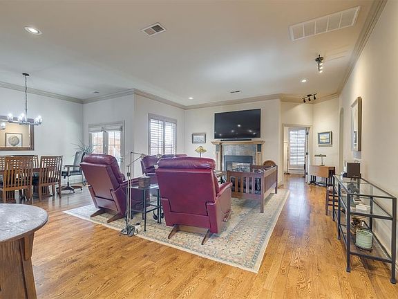 Delightful patio home in excellent condition! It is located in the sought after Georgetowne neighborhood, close to shopping, restaurants and easy access to the Turnpike, Broadway, I-35, and just 15 minutes from downtown OKC.  Most of the home has exquisite, hand scraped hard wood floors and the bathrooms have tile flooring. The main living is open to the kitchen and dining area. The open kitchen offers stainless appliances, granite countertops, a breakfast bar top, ample cabinet storage, and a walk-in pantry. The main suite is oversized with room for a king size bed plus a sitting area or desk. It also has a full bathroom with two vanities, a walk-in shower, a jetted tub and a walk-in closet with access to the laundry room. One of the secondary bedrooms has a walk-in closet, wood floors, wood shutters and a ceiling fan. The other secondary bedroom has plantation shutters, a ceiling fan, and wood floors. The second living can be used as a study with double doors, a see thru fireplace, a built-in bookcase, and a door to the patio. The back patio is the perfect place to kick back after a long day. A "hidden" stairway in the garage leads up to the walk-in attic with plenty of space for storage. You don't even have to worry about the lawn because the HOA takes care of the mowing and spraying. Some features include: neutral colors, plantation shutters, updated lighting plus they added some can lights, and modern corbels in the kitchen...there are too many wonderful features to mention in this beautifully maintained home! Don't miss out on calling this house your home in SE Edmond's finest community.