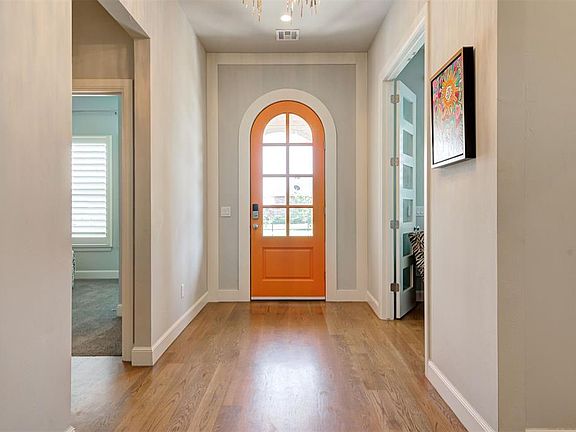 McCaleb homes white Tudor style home. This open concept 3 bedroom home comes with a study, laundry room with sink, and a two-car rear entry garage with an oversized “EF5” storm shelter. The kitchen has a large island with a breakfast bar and extra storage on both sides. The primary bedroom ensuite bath comes with separate vanities and a large walk-in closet. The home features vaulted ceilings with wood beams, a stacked stone fireplace, beautiful light fixtures, granite and quartz counter tops, custom wood shutters and wood floors. The exterior includes a rock-walled garden, a breakfast patio off of the dining room and a 2nd patio for grilling and entertaining. Whole house water filtration system was added. Extra insulation added in the attic and garage for an even more efficient home than when it was originally built. You will probably spend so much time enjoying walking the beautiful neighborhood trails enjoying mornings, evenings and the local birdsong. The HOA includes yard maintenance, access to the resort style Residents Club & pool, recreation room, gym, and studio. The neighborhood also has a playground, beautiful walking trails, a community garden, a catch and release fishing pond with a floating deck and if you are lucky you will see the baby ducklings and goslings each year. The community has annual holiday events, pool parties, sometimes musical guests, and previously has had "Food Truck Fridays". Feel the peace of mind that comes with having a Generac full house generator for when the power goes out. Showings only on Sunday between 2:00-2:50pm. Gas hook up is still available if Buyer chooses to have a gas stove.