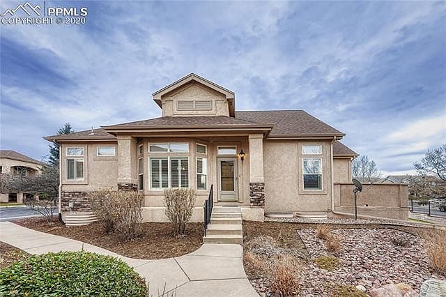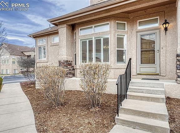 Located within the beautiful Carriages at Charleston Place, this 4BD/3B/2CAR home with 2492 sq ft offers wonderful main level living, finished basement, 10 ft ceilings, plantation shutters, a gas fireplace, 2 living spaces and A/C. The professional landscaping and mature trees are sure to be enjoyed from the semi-private walk-out patio or during a stroll on well-maintained walking paths. The kitchen makes its mark with ample countertop and cabinetry, crown molding, a counter bar, corner sink flanked with windows, pantry and the adjoining laundry room. The dining area is perfectly suited for casual family dinners, holiday meals and celebrations of all kinds with its 10 ft ceiling and bay of windows Enter through double doors to the master retreat which also features several windows allowing natural light to flood the room. Plantation shutters add a distinctive and special touch! His and hers closets and an adjoining bath with double vanity and walk-in shower complete the space. The second main level bedroom would also make a fantastic home office! The basement boasts a large second living area, two additional bedrooms with large windows and oversized walk-in closets, another storage space and a full bathroom. You will forget you're just minutes from shopping, dining and entertainment in this beautiful private setting. The ideal location allows for easy access to I-25, Academy Blvd and Powers Blvd.