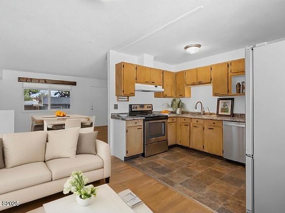Seize the opportunity to own a charming single-family home for just the right price! Plenty of room to enjoy inside and out in a neighborhood that keeps you close to everything you need with an attractive bohemian feel to enhance its charm. While the neighborhood has a serene setting, the community is flourishing. Grocery and department stores, restaurants, parks, and schools aren't far away. ***Some of the images displayed have been virtually staged to illustrate the home's potential and are provided for your convenience and inspiration. Entering front of the home you will see the open living room with extra space and a wood burning fireplace and a heated floor that were added to expand the living space inside in place of the garage. It connects to the kitchen/dining area that look out into the spacious backyard. There is a storage shed in the backyard and a concrete pad poured for an additional storage space or patio area. There is also a separated area for laundry with shelving in the home. There are so many possibilities available with 4 bedrooms with original wood flooring and 2 bathrooms. From office space to a home gym, library, game room and more- the new owner can create their own special space. In the backyard you also will find established flowers and fruit trees growing apples, cherries and peaches. This is a home that will be a part of vibrant and thriving lifestyle for its new owner.