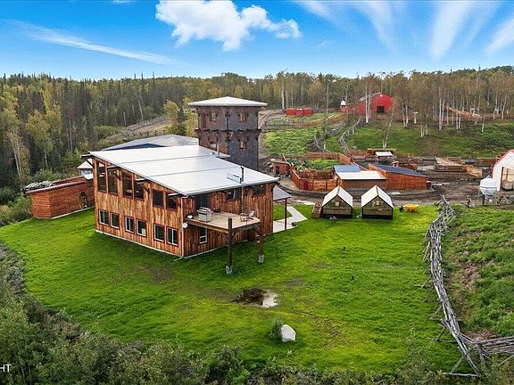 Majestic Mountain View Farm-to-Table Estate on 18+ acres in the small rural area outside Soldotna, Alaska, overlooking miles of Wildlife Refuge for recreational activities. This 6,038 sqft hardy, custom-built, timber-frame home was meticulously crafted with premium Douglas fir, accented by sleek steel and sparkling quartz details with rich redwood siding that exudes warmth & durability.Home features 4-bedroom suites including the Grandeur Suite w/ a large balcony for breathtaking views and deep soaking tub in ensuite. Warm ponderosa pine flooring, custom wood kitchen cabinets, wood stoves w/ subtle high-end finishes of sleek quartz countertops & stainless-steel appliances. Cozy great room with soaring views to host guests. Windows that individually frame the panoramic mountain views and wild landscapes. A greenhouse off the kitchen provides fresh produce for farm-to-table living, supporting a self-sustainable lifestyle. This castle-like residence boasts a remarkably built tower reaching 4 stories up designed for private study, reading, observing wildlife, or just enjoying the all-encompassing scenic views. This large tract of land is the ideal property for equestrian pursuits, agriculture, livestock, and farming w/ cattle handling facilities with corrals, buck n' rail fencing and gates. This highly unique property features a 20x30 Meat locker outside the 6,000 sqft heated shop with two 14x14 garage doors. Shop was built in 2018, which includes a meat shop processing room, 10x10 cooler, 3/4 bathroom w/ washer and dryer, a 2-bedroom apartment upstairs, and significant upstairs storage, tool room, shop has radiant in-floor heat from wood boiler, back-up wood stove and natural gas heating for apartment. All meat processing equipment sold separately. Outside the shop includes a 1000 gallon diesel tank, 300 gallon gas tank, and 300 gallon waste oil tank. Built in 2023 and beautifully designed is the 9,000sqft barn - in which, 7,000sqft has natural gas in-floor heating for keeping cows warm in winter, along with growing feed. A complete commercial fodder production system available for sale separately. Barn features a wood storage area, wood stove, wired speaker system throughout, a back-up generator w/ manual transfer switch. The other 2000 sqft is used as hay storage. Additionally, the barn is on its own well and power. This farmland provides a big gravel pad for truck turn-around, feed storage, and has been used to land a chopper. Additional features includes an insulated grain thawing station w/ electric and natural gas heating with a roller conveyor, 5 automatic in-ground watering systems, 8 separate pens, 4 run-out buildings, 2 covered hay feeders plus line feeders. 2 outdoor green houses, 50x80 Hay Storage, 50x100 fenced garden w/ raised beds, garden shed, insulated chicken house w/ power and 3 pens inside, and a young apple orchard. Squeeze shoot and hoof trimming shoot sold separately. Home and shop have a backup gas generator. Whether you're looking for a recreational escape, a family compound or personal sanctuary, this farm-to-table estate is truly one-of-a-kind. A rare opportunity awaits you, a steal of a deal! Schedule a private tour to experience this extraordinary estate today! The seller is also willing to make this a turn-key operation with additional land and equipment. Seller willing to consider owner financing.