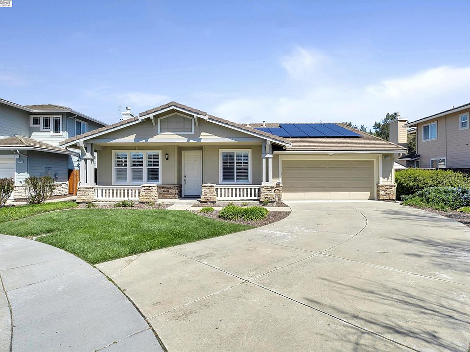Welcome to this beautiful single-story home located in the desirable Niles Glen neighborhood of Fremont, CA. With 3 bedrooms and 2.5 bathrooms, this spacious home offers plenty of room for comfortable living. The open-concept living and dining area is perfect for entertaining guests. Remodeled kitchen features modern appliances, Quartz countertops, and an island with bench seating. The primary suite includes a walk-in closet and a luxurious bathroom with a doorless walk-in shower, and dual vanity sinks. Both the hallway bathroom and half-bathroom have been extensively updated as well. Additional features of the home include a two-car garage, Central A/C, energy efficient heat pump system, recessed lighting, shutter blinds, private back yard with artificial turf, and owned solar! The home is located in a quiet cul-de-sac and is minutes from Quarry Lakes, Union City BART Station and local grocery stores. (HOA gardener for front yard included in dues)