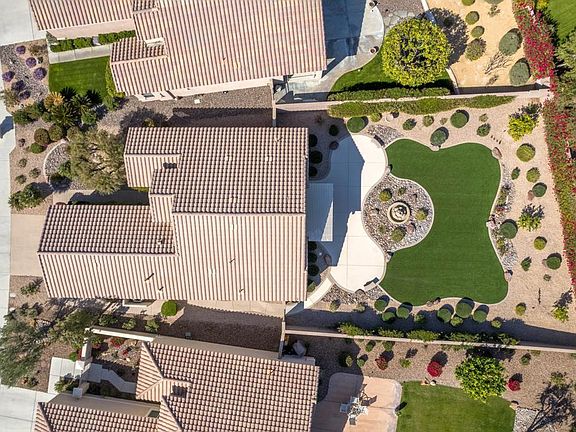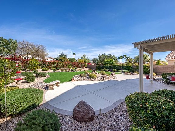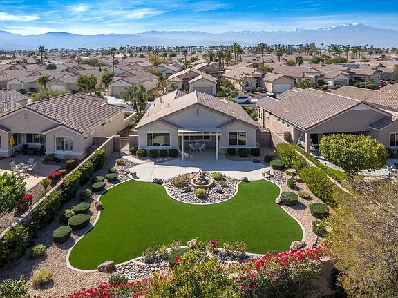 Sun City Palm Desert - Lanai (Extended). Located in the quiet northern section of Sun City, this home is in near perfect condition. The oversized rear yard provides a parklike space that is low maintenance with artificial turf and desert landscaping. A spacious covered patio provides peekaboo mountain views and makes the home perfect for entertaining or relaxing. Available turnkey furnished (outside of escrow). Inside, tile flooring is throughout. All windows have molding surrounds. Ceiling fans and updated lighting are throughout. The living room has a custom built in media center and recessed lighting. The kitchen has abundant light-maple raised panel cabinetry, undercabinet lighting, corian counters and updated appliances. The extended primary suite has a slider to the rear patio, wood-like tile flooring and a huge walk-in closet with built-in storage. The primary suite bathroom has dual sinks and a stall shower with glass enclosure. The guest bathroom also has a stall shower. The guest bedroom has a wood-like tile floor and a closet with built-in storage. The utility room features a built-in desk and cabinetry. The extended 2-car garage can also accommodate a golf cart and has an epoxy floor as well as built-in storage.
