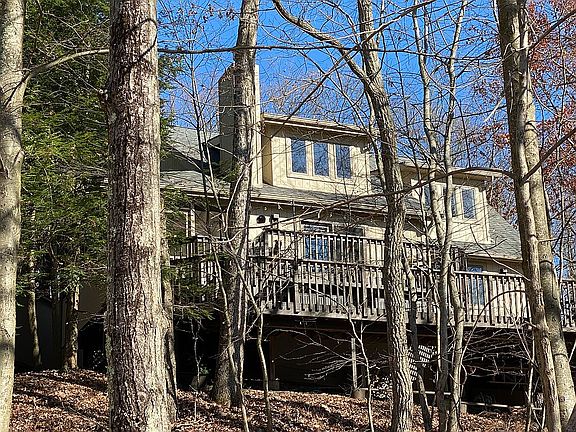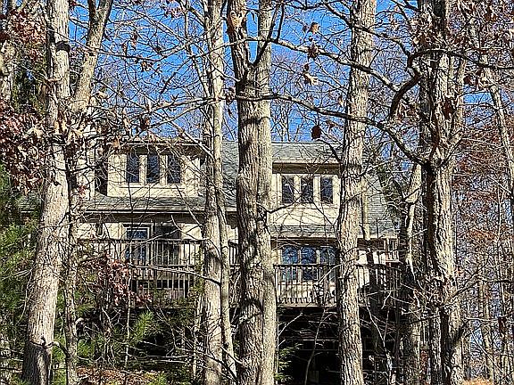 SITTING HIGH ON A HILL SURROUNDED BY TREES, ENJOY THE PEACE AND SERENITY ON 1000SF OF DECKING! A massive oval window and Tuscan tiles greet you at the front foyer, and guide you into the gorgeous pegged wood flr living room, with stone propane fireplace,cathedral opening to the family room loft, and the screened porch. Double doors open to the multilayered deck. 2 bedrms and a jack and jill bath, plus laundry and a powder rm complete the first floor. Second floor Secluded master suite has a private balcony, bath, and Jacuzzi tub, opening to the family area loft, and an office area.