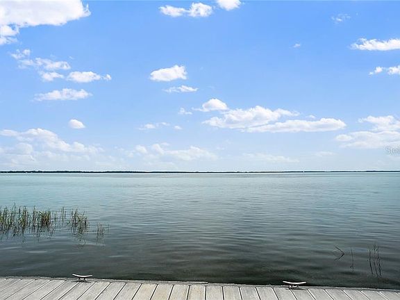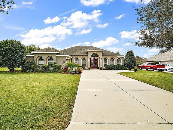 IMPRESSIVE 3/2 HOME WITH PRIVATE DEN AND FENCED YARD IN DESIRABLE BRIGHT WATER PLACE. Welcome home to this tranquil, well-established community situated on the sparkling shoreline of beautiful Lake Eustis. Walk to the community dock to relax and enjoy stunning sunsets over the lake. Arrive home and be greeted with striking curb appeal. A lush, landscaped lawn perfectly frames the home's attractive stucco façade with a gabled roof, arched windows, and covered front portico. The large driveway, extended parking pad, and 2-car side-entry garage provide ample parking for family and guests. Double front doors welcome you inside this bright, open, split-bedroom floor plan with abundant natural light from the many windows with Plantation blinds--tile, carpet, and wood laminate flooring flow throughout the home. Flanking the foyer is a formal dining room and private den/study with French doors. Both have nice windows and crown molding. The family room has a tray ceiling, a wall of French doors to the rear lanai, and is adjacent to the kitchen, making it a wonderful space for entertaining. The eat-in kitchen is lovely with 42 IN richly stained wood cabinetry, Corian counters, stainless appliances including a gas range, a coffee station, prep island, walk-in pantry, breakfast bar, built-in desk, and cozy dining nook. The adjacent laundry room is outfitted with upper/lower cabinetry, folding area, and sink. The master suite has a tray ceiling, plant/art ledges, lanai access, walk-in closet, and double door closet, plus a private bathroom with dual sinks, make-up vanity, garden tub, and tiled shower. 2 guest BRs share a full hall bath with tub/shower. Relax or entertain outdoors in this private fully fenced back yard that features a lush privacy hedge, perfect for family and fur friends. The covered lanai with ceiling fan is perfect on warm summer days. There's plenty of room for outdoor dining. This is a beautiful home in a beautiful neighborhood.