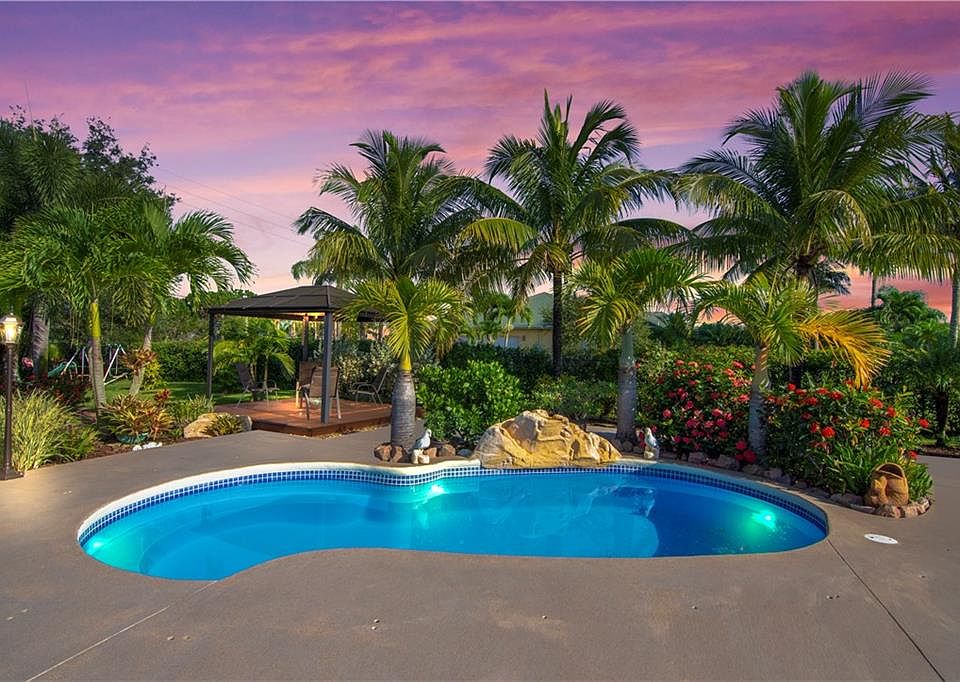 This amazing courtyard home is perfect for the family who loves the outdoors and entertaining! Lush landscaping on over 1/2 acre includes 14 palms, mango, avacado, lychee trees. Main part of the home features 2 beds/2 baths, cabana has 2 bedrooms/1 bath, extra bedroom/office next to garage. NO HOA! Perfect for multi-generational families or possibly Air BNB potential
