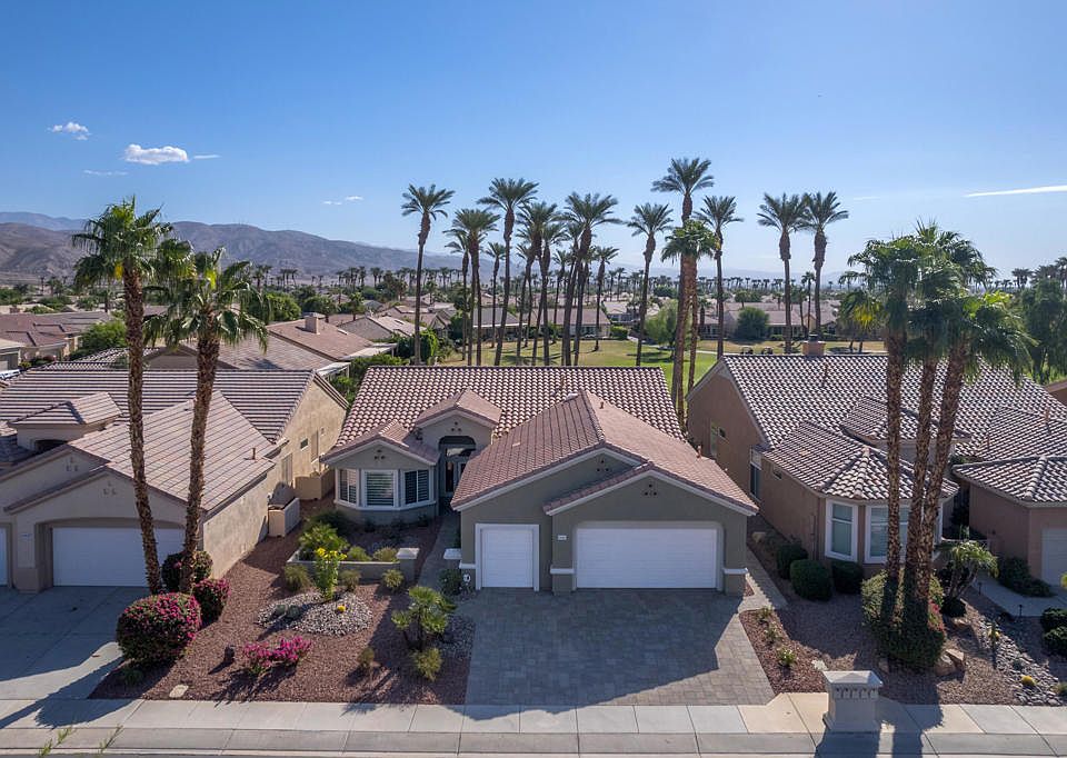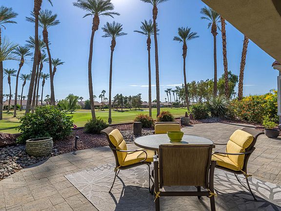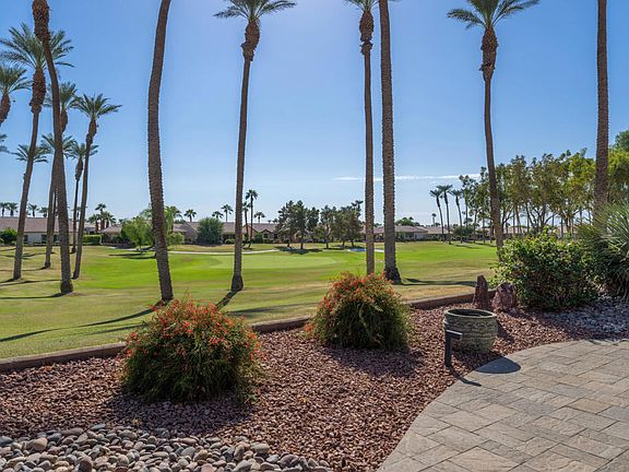 Sun City Palm Desert - St. Croix. Sitting above the 6th fairway, a short distance to the Lakeview Clubhouse, this contemporary remodel of a 3 bedroom, 3 bathroom version of Sun City's most popular model, has panoramic golf course and mountain views. The spacious east facing rear yard has an expanded paver patio surround by lush desert landscaping. The home exudes curb appeal with an updated paint scheme, architectural glass front door and a paver driveway and walk way. Furniture available outside of escrow. Inside, diagonally laid tile is used extensively. The stunning kitchen has custom cabinetry with pullout shelves, stainless appliances, granite counters with a mosaic tile backsplash, breakfast bar and chef's island. The greatroom has solar shades, built-in cabinetry that is perfect for today's large televisions. The large primary suite has a door to rear patio bay, silhouette window treatments and a large walk-in closet with custom built in storage. All three bathrooms have granite counters, upgraded sinks, fixtures, lighting, and rimless glass stall showers with floor to ceiling custom tile surrounds. The laundry room has a utility sink and cabinetry. The extended 2+ golf cart garage has an epoxy floor and built-in storage.
