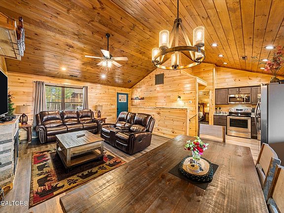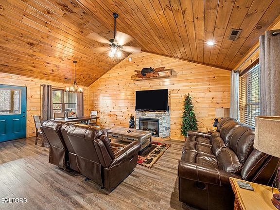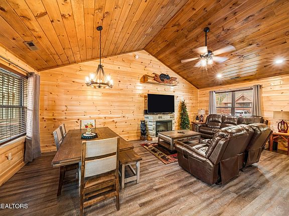 Escape to the charming beauty of Pigeon Forge, TN, with this inviting vacation rental that boasts a classic log cabin style exterior and an unbeatable location just minutes away from Dollywood and other area attractions. Convenient off-street parking welcomes you to your Smoky Mountain getaway. Step inside, and you'll be greeted by an interior that exudes cozy cabin vibes, featuring tongue and groove wood paneled walls and ceilings. The open conceptgreat room boasts vaulted ceilings and an electric fireplace, seamlessly connecting to the dining area and a sleek modern kitchen. Granite countertops, contemporary grey cabinets, and stainless-steel appliances give the kitchen a touch of sophistication, while low maintenance vinyl flooring spans throughout. The great room offers access to an upper-level covered deck, where you can savor the serene, wooded surroundings of the Smoky Mountains. Enjoy grilling on the gasgrill, unwind in the hot tub, or dine al fresco at the table while rocking chairs complete the perfect relaxation spot. On the main level, you'll find a primary bedroom with vaulted ceilings and yet another electric fireplace, along with a private en-suite bath featuring a jacuzzi tub/shower combo. The lower level of this cabin retreat offers even more entertainment options, with a fantastic game room complete with a pool table, air hockey, and an arcade table. For the little ones, there's a twinover full bunk bed, ensuring everyone has a comfortable place to rest. A second guest suite with an electric fireplace and a private bath, featuring a jetted tub/shower combo, adds to the convenience. A powder room and laundry closet complete the lower level. Step out onto the lower-level deck, providing another wonderful spot to sit back and relax. And if you're looking for a refreshing dip, Brookstone Resort offers a seasonal swimming pool, adding to the amenities of this fantastic vacation rental.