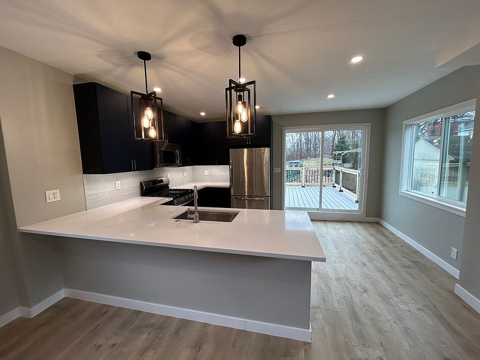 More pictures to come. Beautiful modern looking home with updated kitchen, bathrooms, and a large kitchenette upstairs. Home is situated on a large lot across the street from a quiet park. Renter is responsible for all utilities.