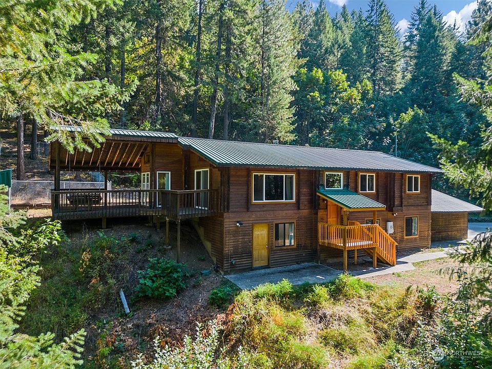 Warm and inviting Pan Abode log home on 21.58 acres divided into 3 contiguous parcels bordering US Forest Service land. Tucked away in the Blewett Pass corridor with close access to Alpine Lake Wilderness trailheads. This home's main level features 3 bed, 2 ba, and an open layout kitchen/great room with beautiful exposed wood beam ceilings. Just off the living room, you’ll find a large covered deck for entertaining and in the side yard a covered pet kennel and fenced run. Highlights of the home's lower level include a family room, media room, and two add'l bedrooms. The 21 acres are covered with Douglas Fir, Ponderosa Pine, numerous hiking trails, and elk-filled open meadows. Bring your hiking gear, snowshoes, & enjoy this amazing property.