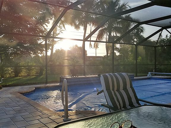 ASSESSMENTS PAID! Fabulous Location! This home is located close to everything in the cape and close to Fort Myers. City Water and Sewer. Built on 3 lots this remodeled 2 bedroom 2 bath home features large carpeted bedrooms with large closets and tile floors in the living room, dinning room, and kitchen. The Florida room opens into the caged 35' by 16' pool and patio. Pool area privacy in the back yard is provided on all sides by chain link fence and areca hedge. The Roof was replaced in 2005 in 2015. The A/C split system for the Florida room was installed 2015. In 2015 kitchen and bathrooms were completely remodeled and water supply piping was replaced; High efficiency hurricane rated windows were installed 2016.