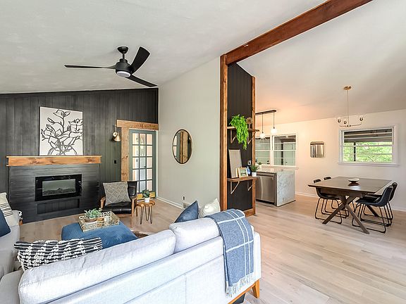 Remodeled mid century modern 4 Bedroom, 2.5 Bath ranch on a partially finished walkout basement. Vaulted ceiling in the open living room, which features an electric fireplace and is adjacent to the eat-in kitchen which features new cabinetry, granite countertops, tile backsplash, stainless appliances, under cabinet lighting and island. Main living areas and primary suite have new hardwood flooring. New, luxury carpet and pad in the secondary bedrooms. 2 car attached carport & lots of storage. Conveniently located close to shopping, schools, NCR and more. Beautiful large yard backing to a creek.