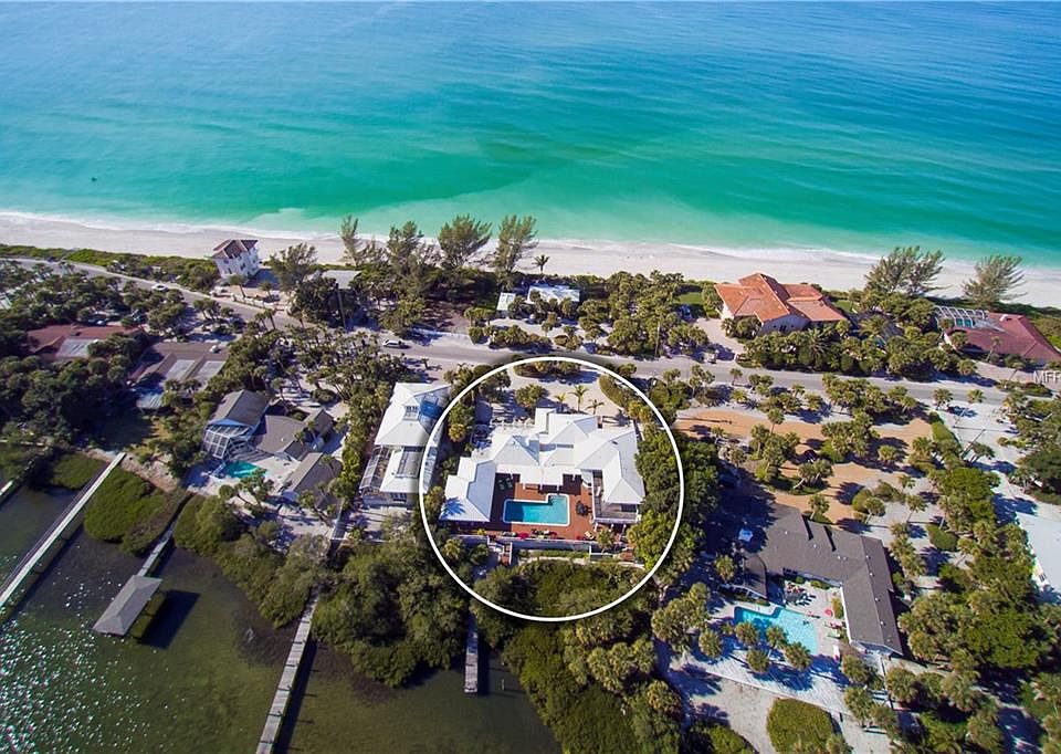 Welcome to this uniquely designed & built Key West style bayfront home set on over half an acre in this convenient mid-key location, on idyllic Casey Key, the 8 mile barrier island situated between Siesta Key & historic downtown Venice. The rich wood paneling is evident of the original owner who, as an heir to the Weyerhaeuser timber fortune, appreciated the warmth of fine paneling detail in the main rooms. You and your family will enjoy the comfortable open floor plan with its volume ceilings, dramatic fireplace, & walls of glass opening to the resort-style pool and decking. Two guest ensuites are in separate wings on the ground floor; the cook's kitchen allows for easy meal preparation to be enjoyed in either the formal dining room or on the terrace. Retreat to the master suite on the second level with beautiful gulf views, chic & modern double baths, double walk in closets, two offices, & an additional balcony with stunning bay views. Venice airport is conveniently located just 10 minutes away from Casey Key where private jets can land & charter services are available. One of the aspects that makes Casey Key unique & desirable is there are fewer than 400 single family homes, no commercial activity & a ban on high-rise structures. Because the 8-mile strand of properties can never get longer, sprawl inland or soar upward, demand for Casey Key properties continues to increase as buyers look for serenity & casual beach life with private dockage at most bay front residences. Truly a place to call "home."
