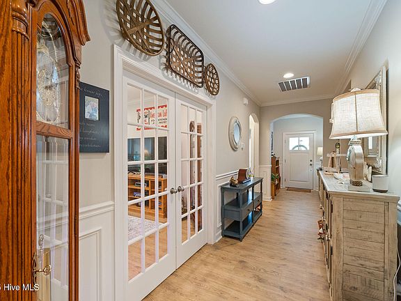This popular floor plan the Moncrest by True Homes built in 2018 is a coastal cottage retreat tucked away at the end of a peaceful cul-de-sac in the Woodlands neighborhood of St. James Plantation. The private fenced backyard with electrical powerlines beyond creates a truly secluded space. This easy living 3-bedroom, 3-full bathroom home offers 2,625 square feet of comfortable living space, thoughtfully designed with character and curb appeal. A concrete driveway leads to the 2-car garage accented with cottage-style details, including shaker shingles, an eyebrow pergola, and stacked stone that gracefully wraps around to the inviting front porch. Tapered columns resting on a stacked stone base, paired with classic white railing, create a warm and welcoming entrance that continues into the bright and inviting foyer. Step inside to find a warm and inviting interior where an arched doorway, custom wainscoting, and luxury vinyl plank flooring set the tone for the home's graceful design. The open-concept layout flows seamlessly into the great room, highlighted by a coffered ceiling that extends over the dining area, elegant crown molding, a cozy gas fireplace, and custom built-ins. Perfect for both everyday living and entertaining, the expansive kitchen offers abundant storage, quartz countertops, and stainless-steel appliances. A large island with pendant lighting and counter-height bar seating for four creates the ideal gathering spot, connecting the kitchen and great room in both function and style. From the great room, pass through one of two arched doorways into the bright and airy sunroom enjoying peaceful views of the private fenced in backyard. Atrium doors open to a screened patio that offers views of the wooded landscape and the perfect place to take in the mild Carolina weather. The owner's suite features a tray ceiling, crown molding, and an accent wall that adds architectural detail. An arched doorway leads past two spacious walk-in closets and into ensuite