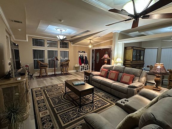 3528 Lauren Court Ellenton, FL is in Ridgewood Estates which is a 55+, Pet Friendly Community. This home is on a rented/leased lot. It's referred to as "The Big House". This 3+BR/2BA 2007 Palm Harbor 'quad' is over 3,000 SF of pure luxury and convenience; built at a cost of over $400,000. A 4-Point inspection provided by the seller. No expense was spared. The home is large enough to accommodate two families and is handicap accessible. As you enter the Great Room through the elegant double front doors, your eyes are drawn to the vaulted, tray ceilings, lighted niches, ceiling medallions and freshly painted sheetrock walls. This 12 room house includes 3 bedrooms, a library and office (both with custom built-in cabinetry), a formal and casual dining room, a workout room or craft area, a storage room, an enclosed porch area, a covered lanai and a single car attached garage with a work shop and electric lift. There are some transom windows and vertical blinds throughout. The large newly remodeled kitchen is fit for a chef complete with GE Profile appliances, 2 dishwashers, 2 refrigerators, 18 inch ceramic tile floors, a center island cooktop, under counter lighting, seemingly endless storage and a walk-in pantry. The master bedroom has carpet, vaulted ceilings and sheetrock walls. The master bath has dual vanities and includes a tiled walk-in shower. The master bedroom dual person walk-in closet has custom cabinetry. The master bath connects directly to the laundry area (washer and dryer included in the sale). One guest bedroom is laminate the other is carpet. The hall bath has a new shower enclosure with a vanity. Upgrades include two new AC units (2021), new Fisher & Paykel double dishwasher (2021), a new GE Profile built-in Microwave oven (2021) a new Reverse Osmosis water filtration system (2021), a new A.O Smith hot water heater in 2023 and new roof 2024. A side deck was added in 2023 with a SunSetter retractable awning. The Great Room and Library have new 20 mil vinyl flooring. Lot rent is ~$1175 per month and includes lawn maintenance and all the community amenities. The home is handicapped accessible with an electric lift in the garage to access the main level of the house. Ridgewood Estates has a Clubhouse, 2 community pools, shuffleboard, a workout room, monthly newsletter, planned activities, and 2 gated security entrances. The location is within minutes of downtown Bradenton and the Gulf beaches. Florida MH Sales, LLC cannot guarantee or warrant the accuracy of this information, measurements, or condition of any property. Measurements are approximate. All homes are sold "as is" and personal or professional inspection is encouraged. Lot rent is set by the community and is subject to change. All buyers must be approved by the community prior to closing on a negotiated sales contract.