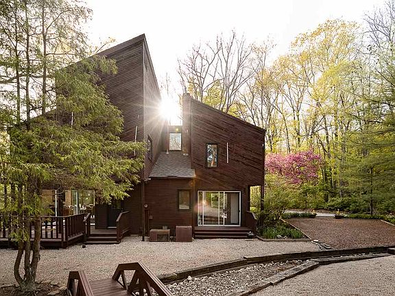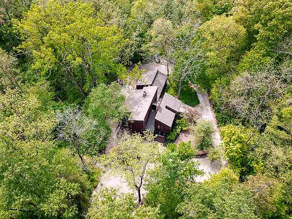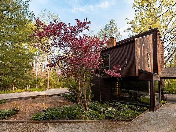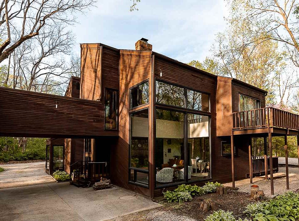 They had a front row seat to nature's most spectacular show. Cozied in by the fire, coffee in hand, they observed sparrows, foxes, hawks, deer, owls, and more. Floor-to ceiling windows set the stage, welcoming the outdoors in to their modern architecture home set on 5.5 wooded acres. It was as if the home was part of the woods. English plank flooring and cedar walls complemented stained glass, a brick-surround woodburning fireplace and more for an interior that was just as organic and naturally beautiful as the property, which boasted two creeks and 17 walnut trees. Guests couldn't believe the modern architectural design, and at night when the glass rooms lit the surrounding foliage, welcoming visitors with an ember warmth, the travellers would claim it was magical. No, not magical, they'd say. It's home. Home Details: 2,552 square feet; 5.5 wooded acres; four bedrooms; two and a half baths;designed by Fort Wayne architect Alan Grinsfelder; rare modern architectural style brings the outdoors in; hardwood throughout with ceiling hand hewn rough sawn fir beams, old English plank-and-nail flooring, and stained cedar walls; kitchen has granite countertops and stainless steel appliances; dining room has walkout to deck; gas fireplace in family room; woodburning fireplace in living room; master with ensuite bath has private deck; beautiful floor-to-ceiling windows create "glass rooms"; laundry chute; four decks total; 2.5 car detached garage attached to home by portico; wooded lot has no grass (low maintenance) and 17 walnut trees, two creeks, and beautiful wildlife; central vacuum system; ample storage; two furnaces; two ACs; Southwest Allen County Schools. Last 6 months gas average is $147, REMC average $138.