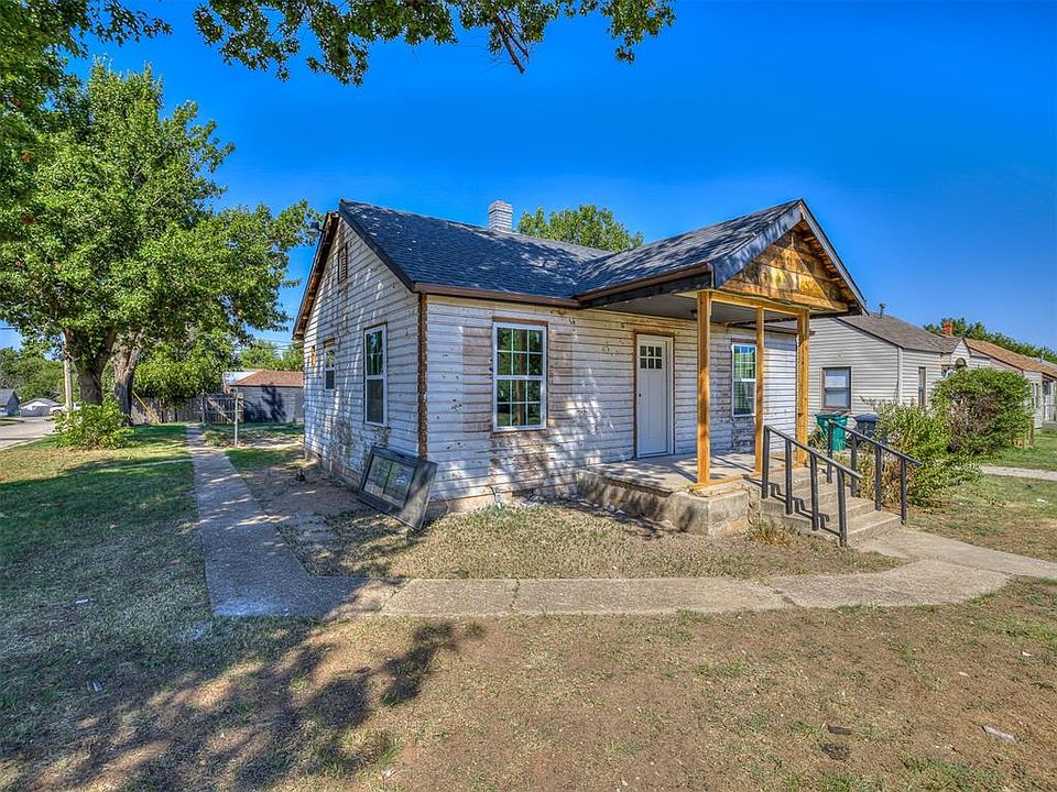 This home, being sold as is, sits on a corner lot and has had a lot of the work completed. It's ready for your exterior touch! The home has new windows, new baseboards, new paint, and new light fixtures in the living area and bedrooms. The original living area and bedrooms have the original hardwood floors. The kitchen and bathroom have been renovated with new flooring, light fixtures, and tile. The kitchen also features new cabinets and a modern backsplash. Upon entry you'll find freshly painted walls, and a sleek mock fireplace. Off the kitchen you'll find a large room that is set up to be a living/dining area. This are could easily be large 3rd bedroom while utilizing the original living area as a dining area. There are several possibilities with the space! Outside there is a storage shed and one car garage. There is a good sized covered back porch/deck. Home is conveniently located near I44.