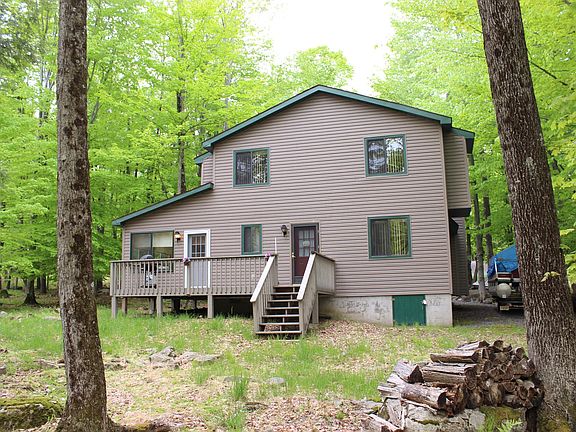 Vinyl sided chalet in a four season amenity filled community in The Northern Poconos, just over two hours from the NYC and Philadelphia Areas. This 3 bedroom 2 bath home has a loft and a large sunroom for additional space. There's an open floor plan, knotty pine kitchen cabinets, knotty pine ceilings, hardwood floors, a brick fireplace, a read deck and shed. The amenities include lakes, beaches, pools, clubhouse with restaurant and pub, golf course, ski hill, tennis, indoor recreation complex with tennis/fitness center/arcade and more, basketball courts, ball fields, children's playground, miniature golf, walking trails, arts and crafts, a great recreation program including day camp for kids, campground, 24 hour security, gated access, must have an appointment with an agent to tour.