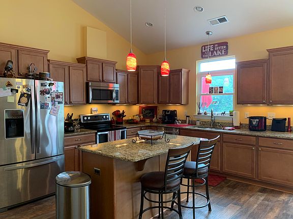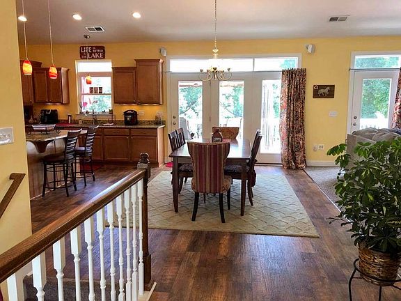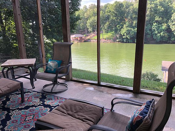 You feel like you are on a ship with beautiful unobstructed water views from this home positioned just 77' from the shoreline. Beautiful point lot with fenced back yard. Incredible dock for entertaining. Built in 2015 Sellers are the original builders. So much to mention!!! 2 car garage up & huge 3 car garage under, paved drive, 3 bedroom + office, 3 1/2 baths, Granite counter tops, new carpet, transom windows, fireplace, water softener system, pull out drawers in kitchen cabinet, walk-in closets, house wired for surround sound, wired for generator, 400 amp service, dual zone heat pumps, electronic locks, dedicated line for gas grill, huge decks & covered decks below, screened corner porch, point lot 175' shoreline with deep water - over 30' deep at end of dock. All new treads on