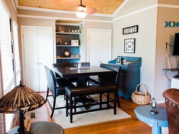 #5192-This home located on year round water in the Butler Branch area has 3BR/1BA with an open kitchen-dining area and den. Large windows in the den have a beautiful view of the gently sloping lot and the water. The home features deck on the back with lake view, boat house with 8x16 ft. covered area, 10x24 ft. or ''full size'' covered slip and 16x20 ft. swim deck.