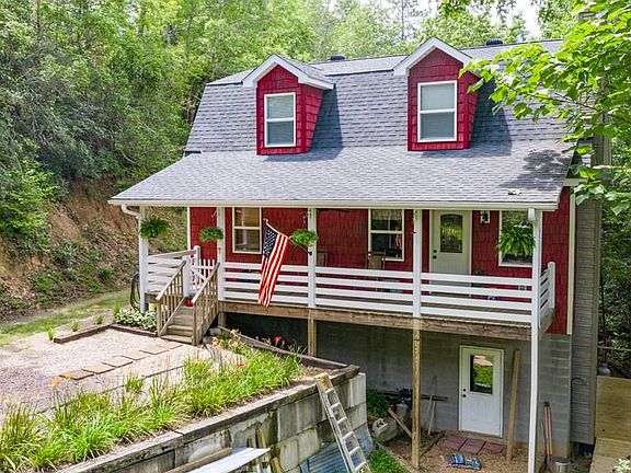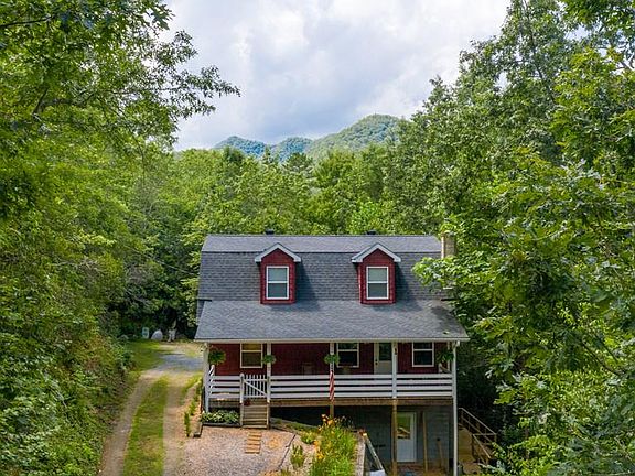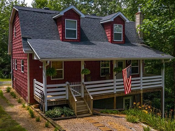 Great Mountain Getaway! You actually ford a small stream in the road and once there you can hear the birds and watch the wildlife from your front porch. And its only 20 minutes from town. The main level has an open kitchen/ living/ dining great room area with wood floors, custom cabinets & granite counters. A master suite on the main level with a full bathroom, walk-in shower, washer/ dryer, 2 walk-in closets & a pantry. Heading upstairs the entire floor is another master suite with a large full bathroom, Corian vanity top & large walk-in closet. The lower level is all set for guests or in-laws or a child who has returned home...A second complete open living/ dining/ kitchen area with an Appalachian wood stove, wood plank & stack stone walls PLUS another full bathroom w/ washer/ dryer hookup & a bonus room with a closet. The wood plank walls, open shelving & corrugated tin ceiling in the lower kitchen area really add to the cabin feel. French doors in the lower level allow for lots of natural light and access to the lower terrace. Two heat pumps for climate control on all 3 levels and a 30 gallon / minute well. Nice private setting with only one more neighbor up the road.