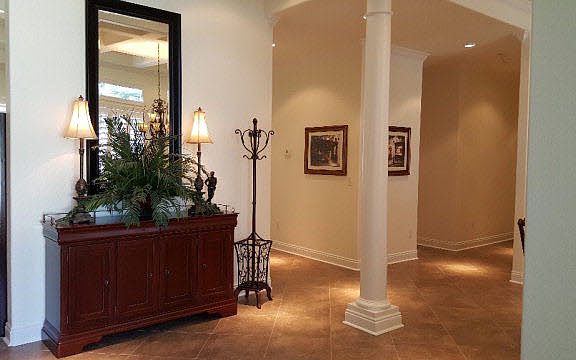 The kitchen with huge island and tons of dark wood cabinets is open to the large family room making this the perfect gathering place in the home. The split floor plan with two guest rooms and two full bathrooms on one side of the home and the luxurious master on the other side of home that includes master bath with new walk in tile shower. The flow of this home is perfect for a family, professionals working from home, or retirees who enjoy space in a home. The screened lanai looking onto golf course is the perfect outdoor area for entertaining. The circular driveway allows plenty of space for parking in addition to the 2-car garage.