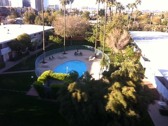 Outstanding View Condo located in "mid-town" Phoenix approximately 3 miles north of downtown in close proximity to Central avenue and the light rail. 5th floor unit overlooks, mid town high rises, North and Camelback Mtns. Unit has been completely remodeled with hardwood and travertine flooring, cultured stone walls, slab granite counters, marble backsplash and walls, custom halogen lighting throughout, stainless steel appliances, separate balcony with Saltillo tile overlooks courtyard, community pool. walkin closet, amazing bathroom with double vanity, oversized shower. Full sized washer/dryer utility closet, Fully furnished with flat screen TV, internet, all utilities. Must See This is a turnkey, fully furnished condo for short term or vacation rental. Utilities are an extra $150/month. Condo was rebuilt from the studs out several years ago, too many custom features to mention.