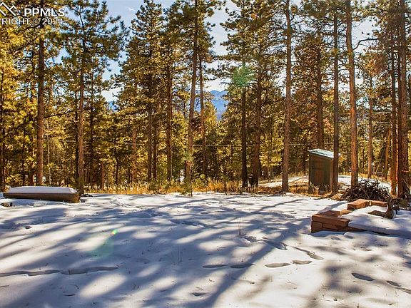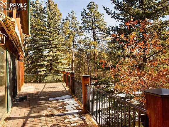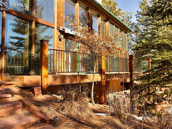 Excellent location at the end of a cul de sac, overlooking Pikes Peak on over 1.4 acres of land! This 4 bedroom 4 bath home is situated for solar gain, South facing, facing directly at Pikes Peak, with floor to ceiling soaring windows in the living area. Main level of the home affords a gourmet kitchen, with stainless steel appliances, double wall ovens both convection, and both self-clean. Granite countertops, extensive cabinets, and wall pantry closet. Formal dining room situated adjacent the kitchen and living room, a main level office flanks the living room additionally. Upper level vaulted loft overlooks the living space, and the owners suite adjoins a full bath, with dual vessel sinks, a walk-in closet, vaulted ceilings, and a storage loft. 2 additional large bedrooms are located on this level, one room adjoins a 3/4 bath servicing both bedrooms. The lower level of this home is situated with a large family room with a wood-burning stove. This level does walk-out to the back yard with again views of Pikes Peak. An additional bedroom is located on this level plus a bonus craft room as well as the storage/utility room and a 3/4 bath. The property includes upgrades of an expansive IPE wood deck w/ 19 foot mechanical awning, located on South side for excellent Southern exposure. A metal roof was installed in 2015. A storage shed is located onsite, plus an oversized 2 car garage, as well as a side yard fenced for pets, and RV parking. Extensive mountain walking and biking throughout the neighborhood is available. Come make this home your mountain getaway, on one of the largest lots found in Woodland Park with Pikes Peak views!