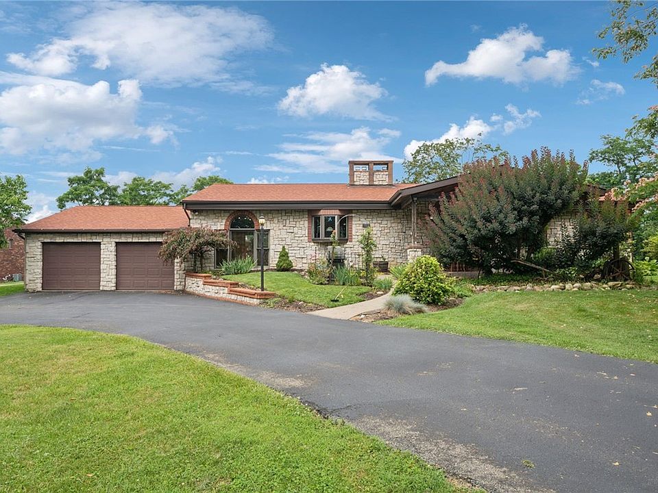 This beautiful stone ranch home offers first floor living in a park-like setting atop 2.3 idyllic acres. Move-in ready with renovated kitchen featuring granite countertops, custom cabinetry, stainless appliances including gas cooktop and double ovens, backsplash and exposed brick. Updated master bathroom has double granite sinks and standalone tub. Brimming with rustic charm, this home features hardwood flooring throughout, wood ceilings with decorative beams and three fireplaces. Finished basement with tons of storage, 5 car garage. Third bedroom is on the lower level. Gorgeous front patio boasts handsome wood ceiling, fan and porch swing: the perfect place to relax. Peace and privacy in prime location in the heart of Washington County; close to Route 19, Meadows and I-79.