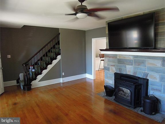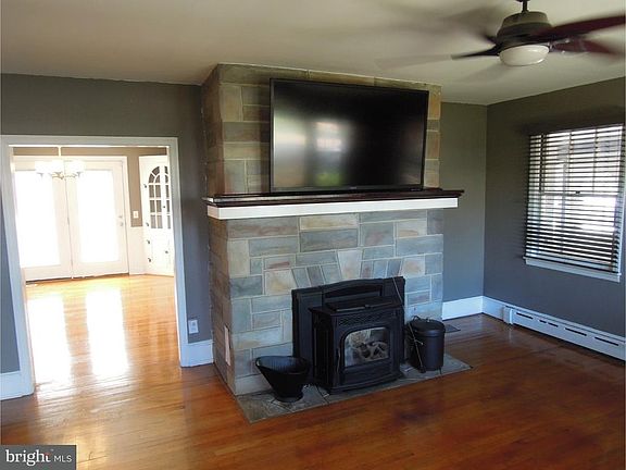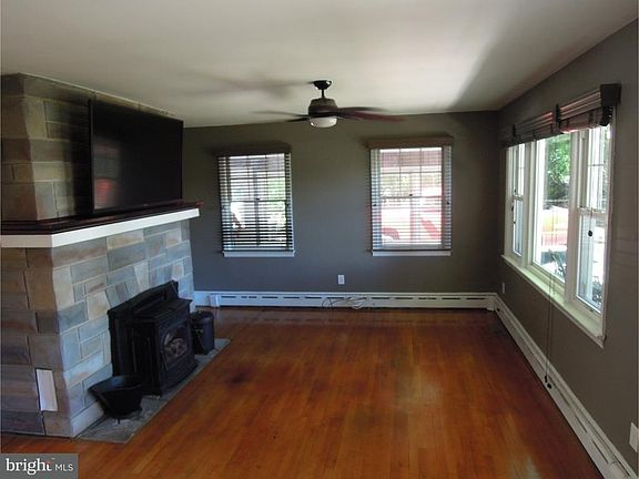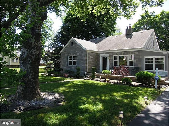 Large Stone Front Cape freshly painted, offers 4 bedrooms and two full (that's right two full bathrooms). 2 bedrooms and one full bath on second floor with large area could be den/computer area or makeup station. Large cedar closet too. 2 bedrooms down with full bath, living room with fireplace, dining room, sunroom and kitchen complete the first floor. Updated bathrooms and windows. All large rooms, lots of closet space, nice rear trex deck through the french doors off the dining room. Huge Sunroom and Large 2 car Detached Garage. Fireplace with wood pellet stove insert. Hardwood floors on both levels, newer 200 amp electrical service, newer heating system. Finished basement with kitchenette area. Large attic for storage as well as 12x10 shed. Very private secluded yard. Minutes from Hamilton Train Station and all majors roads! Lots of space here and tons off parking. Show and sell!!