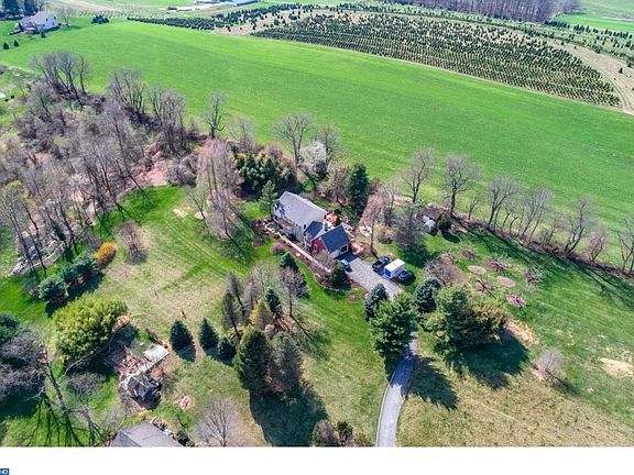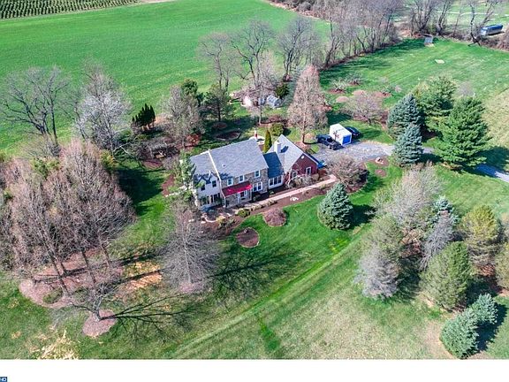 Panoramic views and picturesque setting makes this property one of a kind. This well maintained two-story home is situated on a beautifully landscaped 2.3-acre lot that includes a shed and greenhouse and backs up to the open field of Yeagers Farm. Enter this lovely home through the foyer with stunning staircase, wainscoting and coat closet. The foyer is open to the formal living room with French doors that lead to the office and the dining room with chair rail. The eat-in kitchen features a pantry, island, granite counter tops, tile back splash, stainless appliances including microwave, electric cook range and dishwasher and a slider to the large deck, patio and hot tub. The kitchen is open to the dining room and sunken-in family room with patio door leading to the rear deck, wood burning stove, skylights and ceiling fan. From this room you can also access the 2-car garage and dining room. Hardwood floors extend throughout the first floor and were recently refinished. The powder room and laundry room with utility tub and service door to the deck complete this floor. Upstairs is the master bedroom that includes a walk-in closet and master bath which is tiled and has a shower stall, large Jacuzzi brand soaking tub, granite double bowl vanity and linen closet. There are three additional bedrooms and a hall bath with shower/tub combination, double bowl vanity and linen closet. Completing this home is a partially finished basement that is a great space for entertaining and the unfinished section offers lots of room for storage and is currently set up as a woodworking shop.~