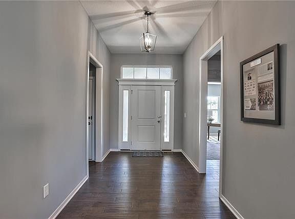 Freemont 2 built by Prieb Homes offers, Entry that leads into a living room full of windows that overlook trees. Fireplace book with vaulted ceilings. Deck is off eat in kitchen. Kitchen is bright, open, large island with walk in pantry and upgraded counter tops. Walk out basement, stubbed and perfect for finishing. Master is large with nature light windows on back, raised vanities and walk in shower. Huge master closet. Utility room is next to master. Great mud roof off Garage. Home is framed. All selections can still be made. Home to be completed end of October. City trail is located directly behind the home and takes you right to Prairie Center Park with lake, frisbee golf, soccer & baseball fields. NEW Lake Olathe just down the street