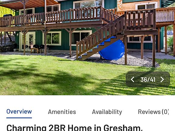 Enjoy the heartwarming charm of this single-story abode nestled in the serene environs of Gresham, Oregon. Designed with thoughtfulness and care, this home boasts 1400 square feet of comfortable living space, ideal for those who cherish indoor elegance and outdoor tranquility. Step into the inviting atmosphere of the primary bedroom, a peaceful retreat featuring a cozy queen-sized bed, two standard closets for ample storage, and an en-suite bathroom with a walk-in shower and single vanity, ensuring privacy and comfort. The second and third bedrooms, each furnished with full-size beds, standard closets, and nightstands, offer additional cozy spaces for rest. The heart of the home is a living area that exudes warmth and comfort, highlighted by a plush sofa, a coffee table perfect for gatherings, a smart TV for entertainment, and a fireplace that adds a touch of coziness to any Oregon evening. The kitchen, seamlessly blending functionality and style, is equipped with modern appliances, including a dishwasher, full-size fridge, electric stove, and microwave, complemented by a coffee maker and toaster oven. The dining area, welcoming with a table set for six, invites shared meals and memories. Flooring throughout the home combines hardwood's timeless elegance with tile's practical beauty, enhancing the overall aesthetic. The outdoor space is equally captivating, featuring a front porch and deck furnished for relaxation, a gas grill for culinary adventures, and a creek that murmurs a calming backdrop to this picturesque setting. Convenience blends with nature, as shopping, parks, and restaurants lie nearby, complemented by easy access to public transportation. Driveway parking and a ring door camera provide added security and peace of mind, making this Gresham house a sanctuary you'll love calling home. Book now! It's mid-term rent. (1 to 3 or 6 months max)