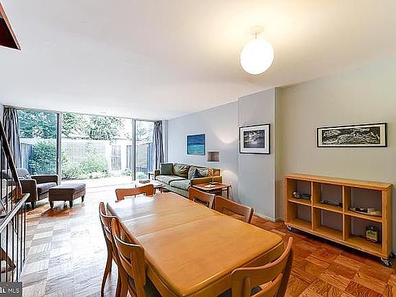 This open and airy mid-century gem is a 3-bedroom renovated townhouse with a back yard. Boasting wall-to-wall windows and a floating staircase and flooded with natural light, it offers three levels of living space with hardwood floors throughout. The townhouse is located in the 11 acres of River Park, a private and quiet gated community right in the heart of the District, just steps from the Wharf and the Navy Yard, 3 blocks from a Metro station, and close to the Mall, Nats Park, Audi Field, and bike paths along the Potomac and Anacostia Rivers. The main level offers an open floor plan with the kitchen, living/dining area with half-bathroom, and infinity wall of glass opening to a new flagstone patio and private back yard. Upstairs are three bedrooms with large closets and lots of light, as well as the renovated bathroom with a soaker tub. The master bedroom looks out over the landscaped yard with floor-to-ceiling windows. The middle bedroom has a floor-to-ceiling sliding glass door and balcony. The front bedroom enjoys a southern exposure with wall-to-wall windows. The lower level is partially finished and offers flexible use as an office, den, or exercise area, along with a laundry room and storage space. The lush urban oasis of River Park offers off-street play areas for children, a full fitness center, an outdoor pool and wading pool, off-street parking, a music room with pianos, a workshop, meeting and party rooms. Monthly fees include on-site maintenance, all property taxes, 24/7 front desk concierge and package reception, heat and hot water, water, air conditioning, security, snow plowing, master insurance, sewer, trash, composting, and antenna TV.