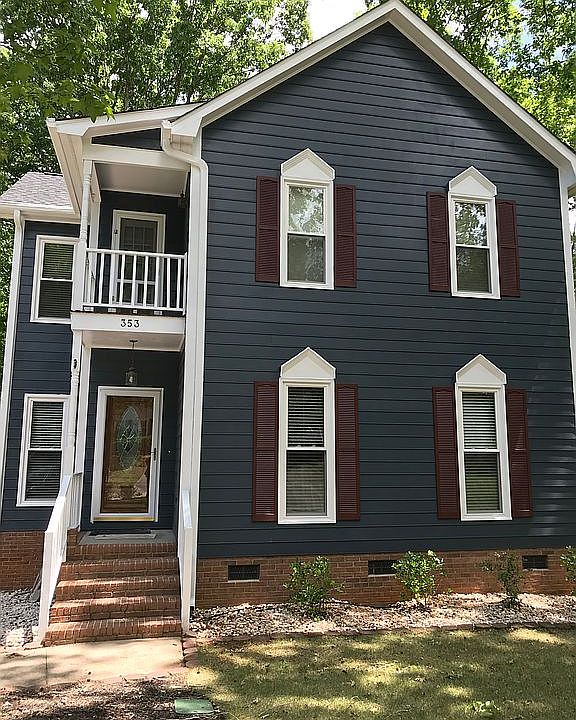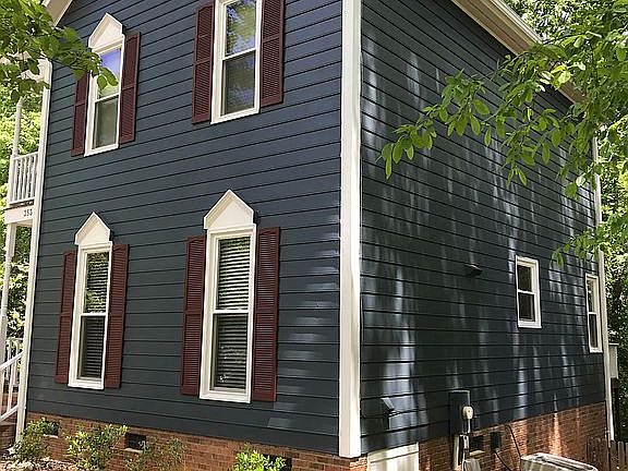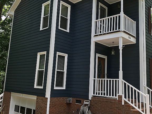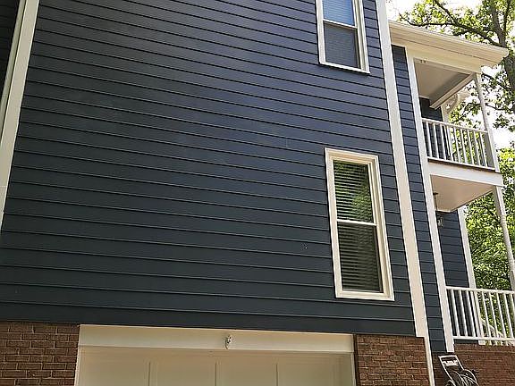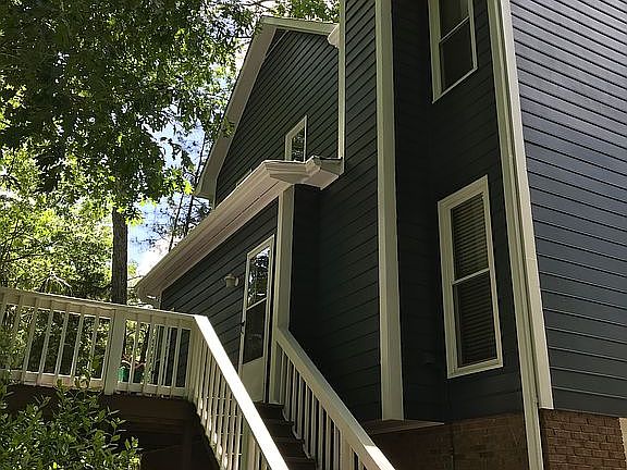 Beautiful blue Charleston style house with white trim. We’ll maintained interior and exterior with major remodel completed in 2020 to include new windows, interior paint, updated kitchen cabinets with quartz countertops, carpet, LVP flooring, exterior paint, Trex decking, and new front door with smart lock. Porch off of the master bedroom, great for relaxing with a morning cup of coffee. Garage on lower level underneath home. Large balcony/deck off of the kitchen, great grilling and outdoor entertainment space. Front and back yard has full coverage sprinkler system. Large eat-in kitchen with wet bar and quartz countertops. Formal dining room. New LVP flooring throughout lower level of house with new carpet in the bedrooms. Two full baths on second floor and a half bath on the first floor. House backs up to woods and Fourteen Mile Creek. Fenced in back yard, very quiet and peaceful.