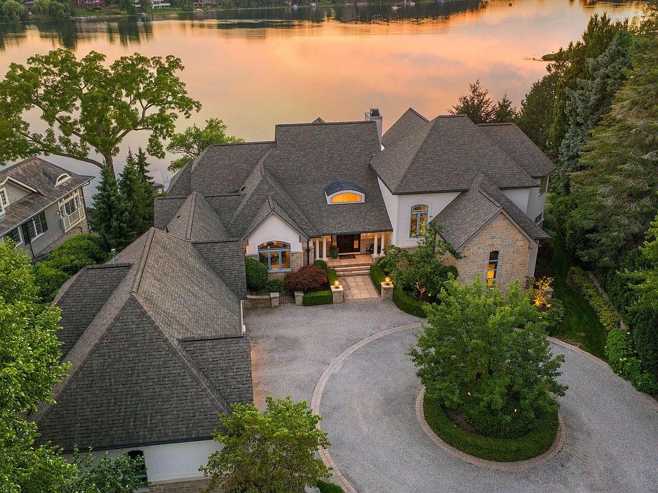 Luxury living at its finest with spectacular lakefront views on Lower Long Lake. Enjoy nearly 8500 sqft of finished living space with 114+ feet of water frontage and extensive outdoor living spaces! Huge living room with gorgeous fireplace, custom built-ins, and vaulted ceiling. The main floor also boasts a large primary suite, formal dining area, 2 offices, a 3-season room, and a laundry room. The gourmet kitchen overlooks the lake and is complete with high-end appliances, granite counters, and a breakfast nook. Radiant heat floors, coffered ceilings and extensive woodwork throughout the home. Elevator access to all 3 floors. Walk-out finished lower level has a 2nd full kitchen, wine cellar, gym with sauna, and 4th bedroom with bath. Heated 4-car garage with EV charger and electronic gated driveway. 24000 kw Generator. Dock and pump house with electricity and water. Beautiful grounds, lake views and the sound of distant bell chimes from Kirk in the Hills. This is truly a special property. Too many features to list. BATVAI.