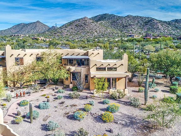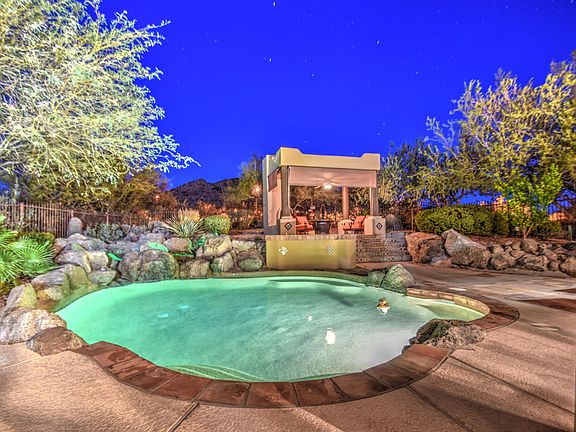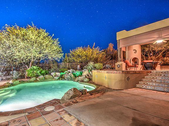 *****Amazing Views**** Just try and find a Custom Home in gated community with almost an acre lot(36,320) for under 700K...and this is at 600!! Stunning Santa Fe/Territorial style home is perched on a expertly chosen, private, cds lot with Breathtaking city, sunset and mountain views from every window in home, not to mention the 2 covered patios and balconies off bedrooms! Great room is huge and features a beautiful Kiva fireplace, peeled log vigas, wood custom doors, and views of the meticulous maintained, lush, mature Sonora desert landscape. Remodeled eat in kitchen with a massive island, new cabinets, granite counter tops and stainless steel appliances, check out the new lighting & plumbing fixtures. Outdoor dining Ramada with fireplace, pebble tech pool with rock water fall.