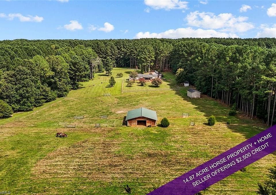 BACK ON MARKET- no fault of seller* Discover your dream country living at this expansive 14.87-acre property with a long private driveway! Only 32 minutes away from the Toyota Megasite and 18 from Wolfspeed! This well-maintained 3-bedroom, 2-bath home complete with an office, offers everything you need to create your ideal hobby/horse farm. Step inside to an open split-floor plan with a welcoming living area that flows into the kitchen and dining space. The home offers three bedrooms, including a primary suite with an en-suite bath. The additional office space is perfect for working from home, or hobby room. Outside is where this property truly shines with over 14 acres, including more than 5 acres of fenced pasture. Riding ring footings in place + RAMM fencing included to finish the ring, perfect for training and exercising your horses. Large, wired workshop provides ample space for equipment or projects, with an additional shed perfect for additional storage. Come check it out TODAY!