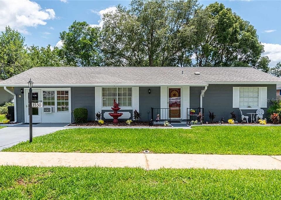 This home has been owned for 22 years by the current owner and there is a high level of pride in ownership! The spacious 2 bedroom, 1.5 bathroom home sits on a well manicured lot with great curb appeal. In the back there is a huge covered lanai with two sheds for extra storage. This is a great area if you have a pet or for your kids to play in. Privacy landscaping makes you feel as though you have no rear neighbors. The kitchen features white cabinetry, a gas range powered by an above ground propane tank, French Door style refrigerator, and ceramic tile flooring. Laminate flooring is located in the nook area and hallway. The home features a newer HVAC system. For extra space the garage has been converted and has indoor/outdoor carpet. This area is under air, but not in the square footage of the home. This area can be used as an extra bedroom, office, or can be converted back to a garage. For additional storage there is a floored attic with pull down attic stairs. This is your chance to own a little slice of paradise!